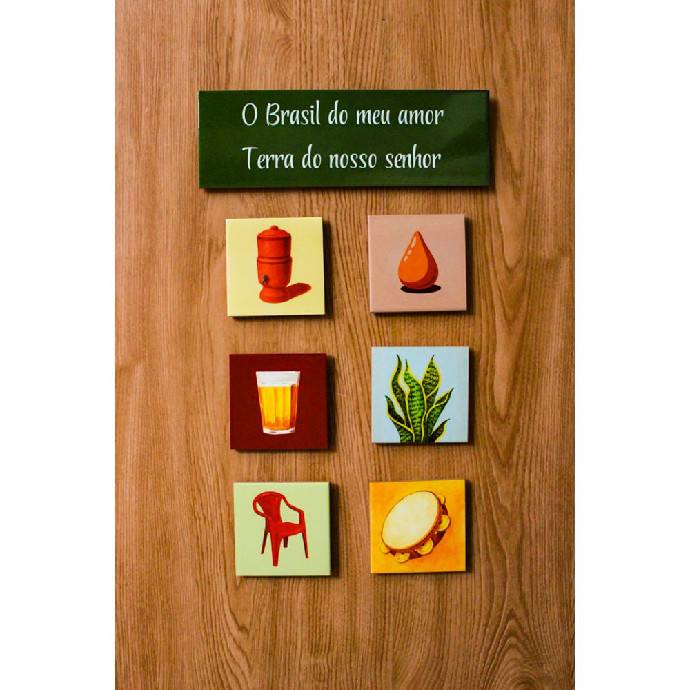 Economia de R$ 58,00Uma combinação que conecta cultura e memória afetiva, composta pelo azulejo decorativo com a frase (O brasil do meu amor terra do nosso Senhor), uma mensagem cheia de pertencimento, junto da composição os minis azulejos se destacam com figuras que simbolizam a brasilidade como, o filtro de barro, a famosa coxinha, aquela cervejinha, espada de iansâ, a icônica cadeira de bar vermelha e o pandeiro, que revela o samba. A combinação que une identidade cultural e histórias.