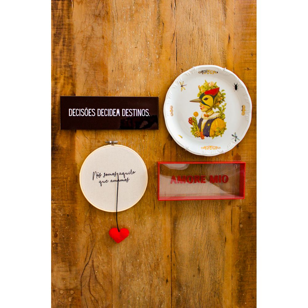 Uma combinação que transmite afeto e escolhas, combinando tons e texturas, o equilíbrio entre força e delicadeza, composta pelo prato decorativo super requintado com a figura de um bem-te-vi, com vestes atemporal carregando verduras, a borda com detalhes em filete ouro se destacam na peça, o azulejo decorativo com a inspiradora frase (Decisões decidem destinos) carrega força e coragem, já o bastidor decorativo vem com delicadeza bordado a mão com detalhe de um coração pendurado feito em crochê, uma peça apaixonante, enquanto o quadro em acrílico com a frase (Amore mio), se destaca em seu tom vermelho e design diferente, uma combinação de parede para chamar atenção para a arte contemporânea e poética.