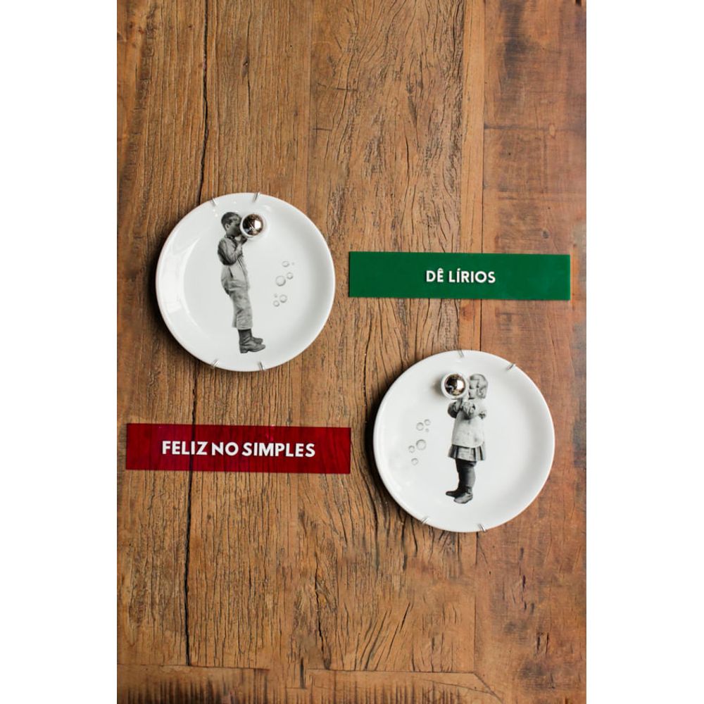 Uma combinação de parede que se compõe com significados, cor e textura, os pratos decorativos formado por duas peças possuem crianças brincando de fazer bolinha de sabão, a peça contém bolas prateadas entregando movimento para a obra, já as placas acrílicos entram com cor entregando equilíbrio para a combinação, e frases em 3d.