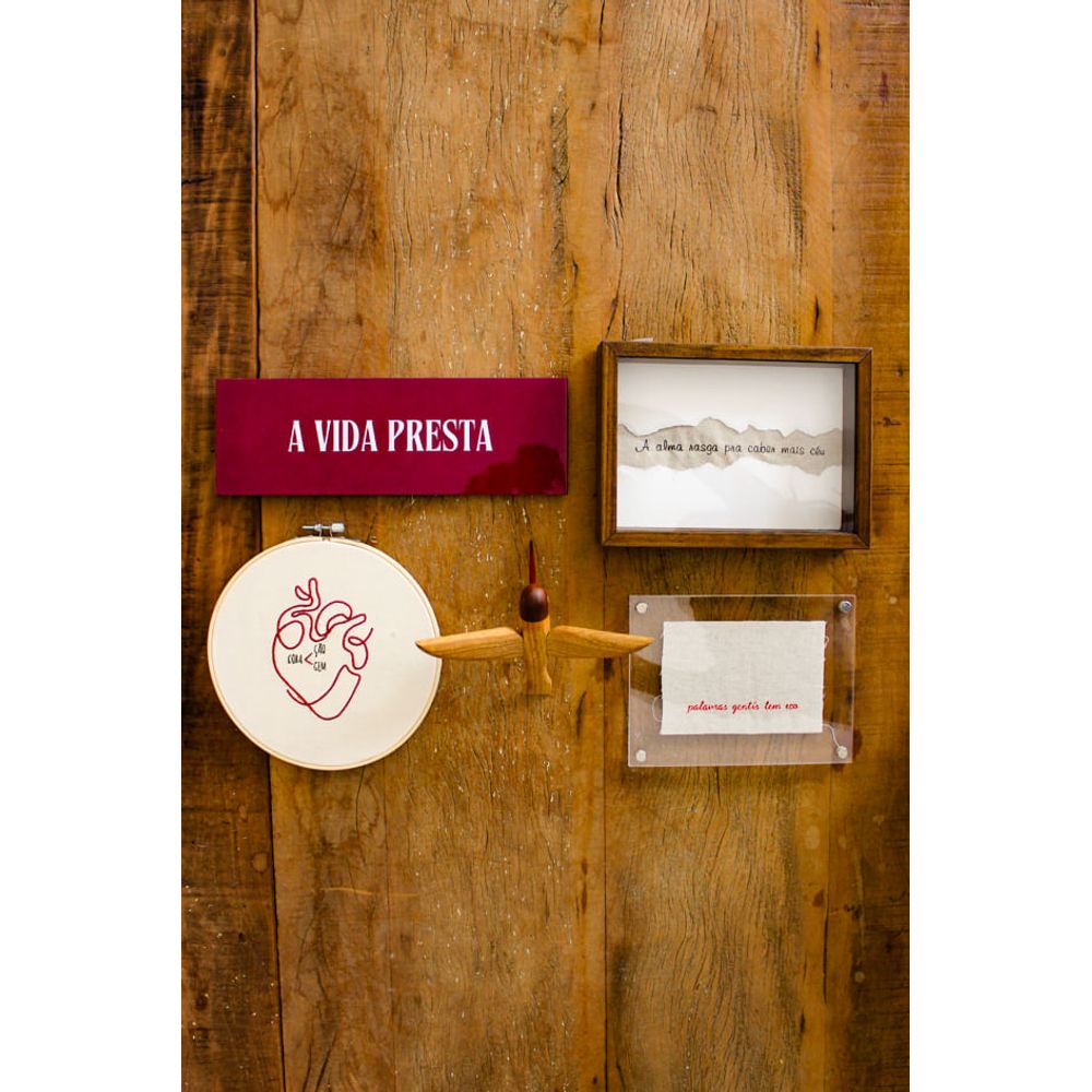 Uma combinação que transmite amor intenso, composta pela placa em acrílico com a frase (Palavras gentis tem eco), um significado entanto, o quadro decorativo em modelo rustico com moldura em madeira tom escuro nos revela a poética mensagem (A alma rasga pra caber mais céu), uma peça artesanal que transmite aconchego, o bastidor bordado a mão vem com delicadeza e afeto, com a figura de um coração com palavras que se entrelaçam, sendo: (Coração) e (Coragem), transmitindo naturalidade, enquanto o beija flor feito em madeira, transmite delicadeza em cada detalhe, perfeito para pendurar na parede trazendo movimento á composição, já o azulejo decorativo com a frase (A vida presta), nos revela tom e mensagem marcante, perfeito para quem ama com intensidade e aprecia cada detalhe.
