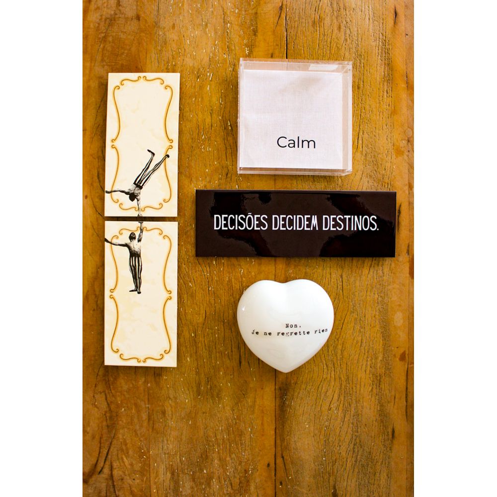 Combinação de parede composta pelo painel de azulejos relique com estampa atemporal e duas figuras com calças listradas se apresentando, como um cenário circense, o quadro em acrílico é uma peça minimalista que transmite leveza com o fundo em tecido branco e a palavra (Calm) aplicado sobre o acrílico, já o azulejo decorativo com frase mercante revela (Decisões decidem destinos) em tom escuro intenso e frase em branco se destacando, a escultura de coração vem para unir o delicado com a frase (Non, je ne regrette rien) traduzida em – Não, não me arrependo de nada, transmitindo força e coragem para a combinação.