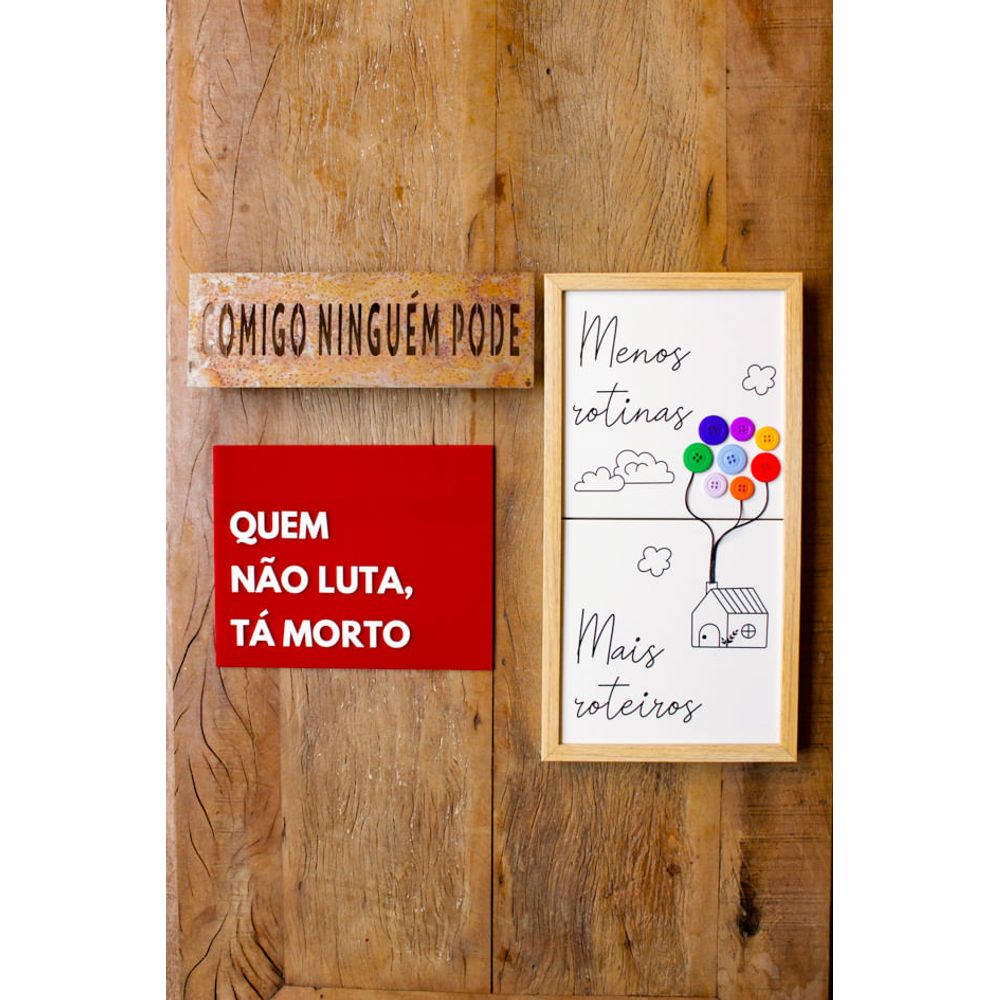 Composição de parede cheia de disposição e segurança, composto pela placa decorativa em ferro com a frase (Comigo ninguém pode), uma peça marcante e autêntica, já a placa em acrílico em tom vermelho vibrante, nos revela a frase (Quem não luta, tá morto) uma peça imponente que se destaca pela cor e mensagem transmitida, o painel de azulejos com moldura clara nos leva á imaginação, com seus detalhes coloridos e divertidos, com a inspiradora frase (Menos rotinas e mais roteiros). Uma composição que une inspiração e encorajamento, um lembrete diário para decorar a sua parede.
