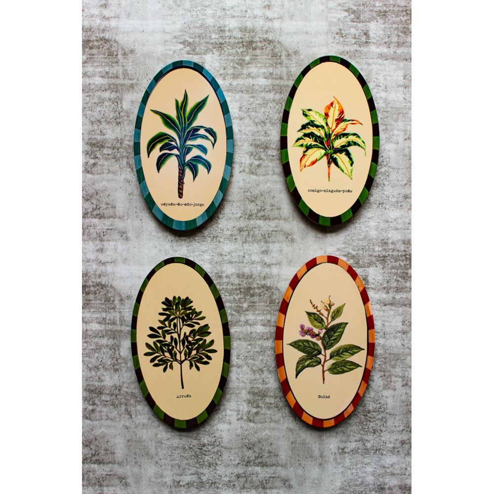 Combinação de parede com azulejos decorativos em formato oval, com plantas botânicas ilustradas que trazem significado de proteção e conexão com a natureza, composta pela planta, guiné e arruda, planta e erva medicinal e espiritual, a planta com design marcante e a frase (Comigo ninguém pode), e espada de são Jorge, linda e conhecida por afastar energias negativas.