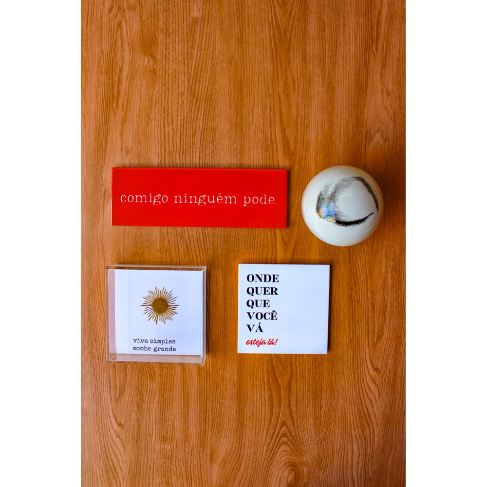 Combinação de parede com uma composição delicada e de apaixonar, composta pelo azulejo decorativo com a frase (Comigo ninguém pode), em vermelho, a esfera decorativa em porcelana possui a figura de um olho fechado e material em porcelana na cor branco, enquanto o quadro em acrílico irradia beleza com a figura aplicada de um sol em dourado, e a frase (Viva simples sonhe grande), já o azulejo decorativo transmite a frase (Onde quer que você vá esteja lá), uma inspiradora frase para completar a combinação de parede.