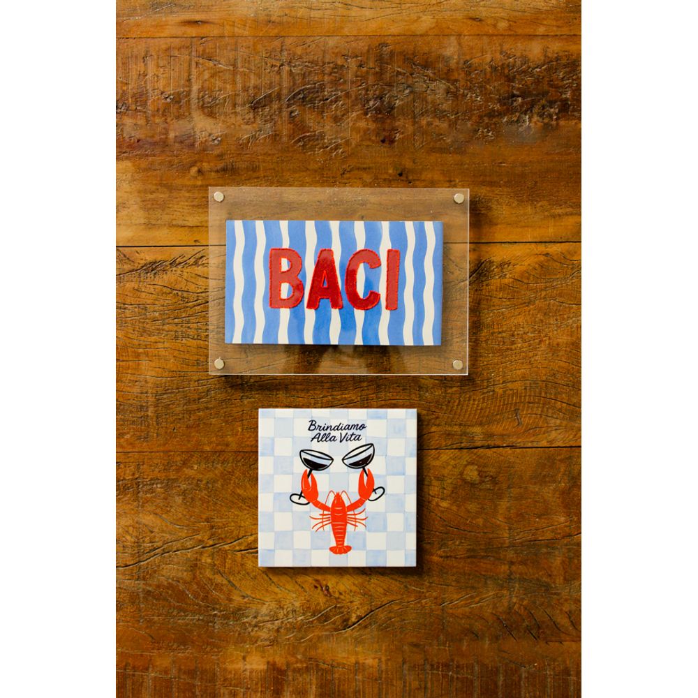 Uma combinação de parede harmônica com o mais amado quadro em acrílico com a palavra (Baci) bordada á mão, que tem por seu significado (beijo) em italiano, um toque artesanal e cheio de beleza, já o azulejo decorativo com a frase (Brindiamo alla vita), é uma peça cheia de energia festiva, nos traz a figura de uma lagosta se divertindo, uma combinação de parede autêntica e divertida para a sua combinação.