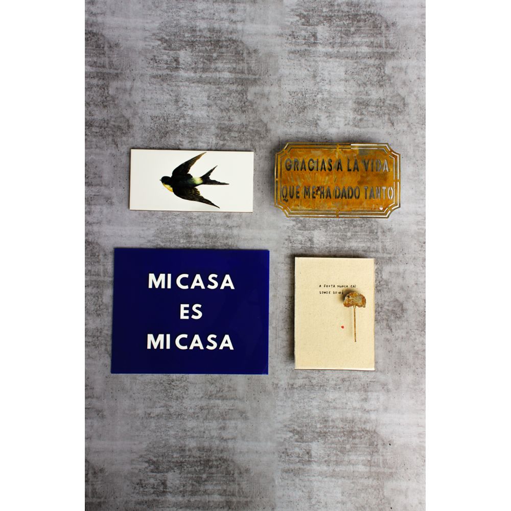 Combinação de parede que traz leveza e admiração, composta pelo azulejo com a figura de uma andorinha voando, enquanto a placa etiqueta com a frase (Gracias a la vida que me há dado tanto), tem sua composição em ferro, ao bater o som a sombra reflete a frase na parede, a placa em acrílico em tom azul destaca a frase (Mi casa es mi casa) com letras empresas em 3d, e para completar a placa em acrílico com a frase (A fruta nunca cai longe do pé) transborda delicadeza com a frase bordada e mini coração vermelho no canto, acompanha a peça uma mini arvore em ferro para grudar na peça, uma bela combinação para a sua parede.