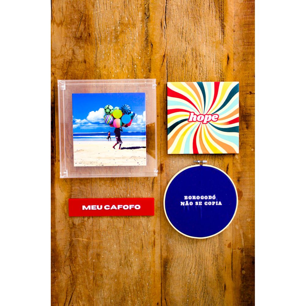 Combinação de parede com peças coloridas, composta pelo quadro em acrílico o vendedor de bolas, aplicado sobre o azulejo uma cena clássica praiana, a placa acrílica com a frase (meu cafofo), entrega a cor intensa do vermelho, enquanto o azulejo decorativo com a palavra (Hope) transmite muita cor em aspiral, o que transforma a combinação, já o bastidor bordado com a frase (Borogodó não se copia) transmite serenidade e leveza com o intenso do tom azul, uma peça artesanal bordada a mão. Uma combinação que transmite alegria e movimento para a sua parede.