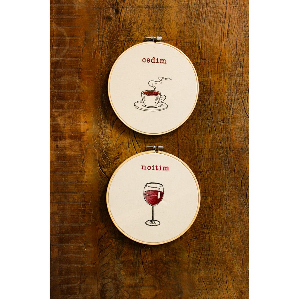Uma combinação de parede delicada com bordados feito a mão, composta pelo bastidor com a palavra (Cedim) juntamente com uma linda xicara de café quente, enquanto o bastidor decorativo com a palavra (Noitim), se destaca com a taça cheia de vinho, uma peça artesanal para decorar com estilo e arte.