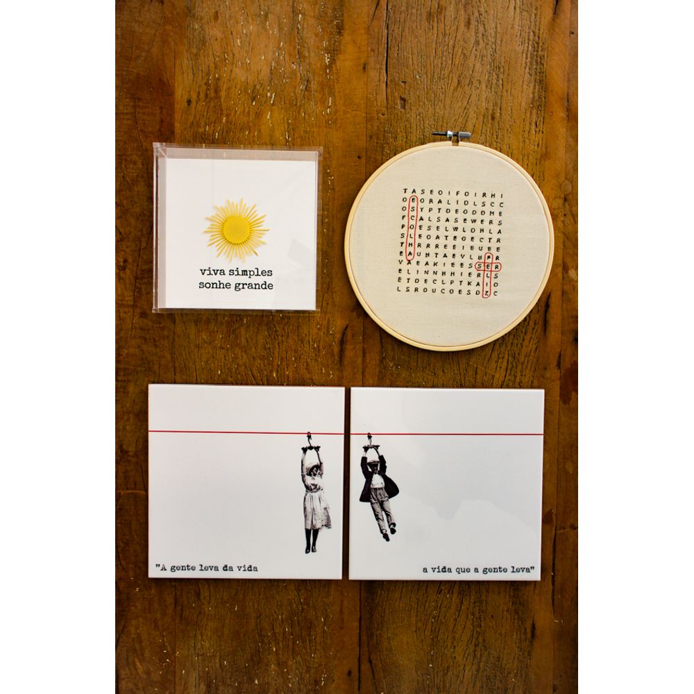 Combinação de parede inspiradora! Unindo bastidor bordado, azulejo decorativo e quadro em acrílico, o querido bastidor caça palavras revela a frase (Escolha ser feliz) entre as letras espalhadas, uma obra artesanal bordada a mão, o quadro em acrílico transmite calmaria, com a aplicação de um sol raiando em tom dourado sobre o fundo em tecido, e frase aplicada no acrílico (Viva simples sonhe grande) reforçando em sempre sonhar em algo extraordinário, e não pequeno para levar para a vida, já o painel de azulejos diverte com as frases que se encontram (A gente leva da vida) e (A vida que a gente leva) com duas figuras com vestes atemporal, se divertindo em uma tirolesa.