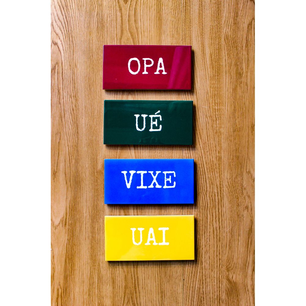 Combinação de parede com expressões populares brasileira, composta pelos azulejos decorativos com a palavra (Opa) em tom bordô, (Ué) em tom verde, (Vixe) em tom azul e (Uai) em amarelo, falas que estão na ponta da língua do brasileiro, em momentos de descontração ou até mesmo uma conversa, decore a sua parede com cultura e originalidade.