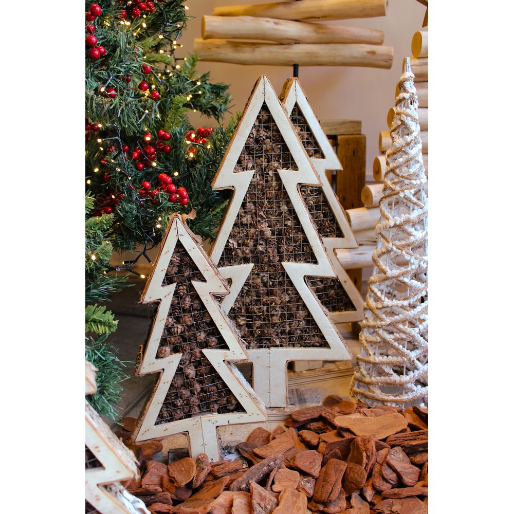 Uma dupla com design rústico para compor decorações de natal, o pinheirinho decorativo feito em madeira é uma peça com o interior preenchido de mini pinhas, preso por uma gradinha. Para quem prefere uma decoração mais rústico e elegante esta é a opção perfeita para compor a sua decoração, criando um espaço temático próximo a árvore por exemplo. Composta por dois tamanhos diferentes, sendo P e G, para você criar uma decoração ainda mais completa!