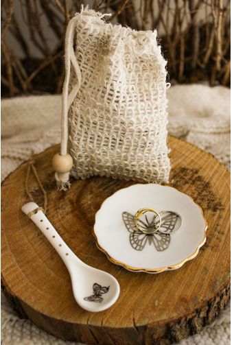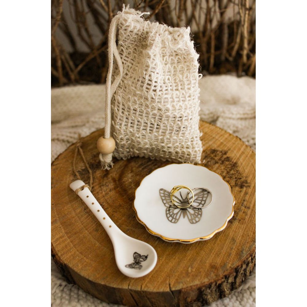 A dupla de colher e mini pratinho de porcelana traz bordas onduladas e filete ouro, dando todo um destaque de luxo para as peças, as peças estampam uma delicada borboleta, que traz o significado de liberdade e transformação, preciosas peças que carregam significado e beleza, o conjunto acompanha uma bela bolsinha com acabamento, se transformando em um presente perfeito que já chega pronto para presentear.