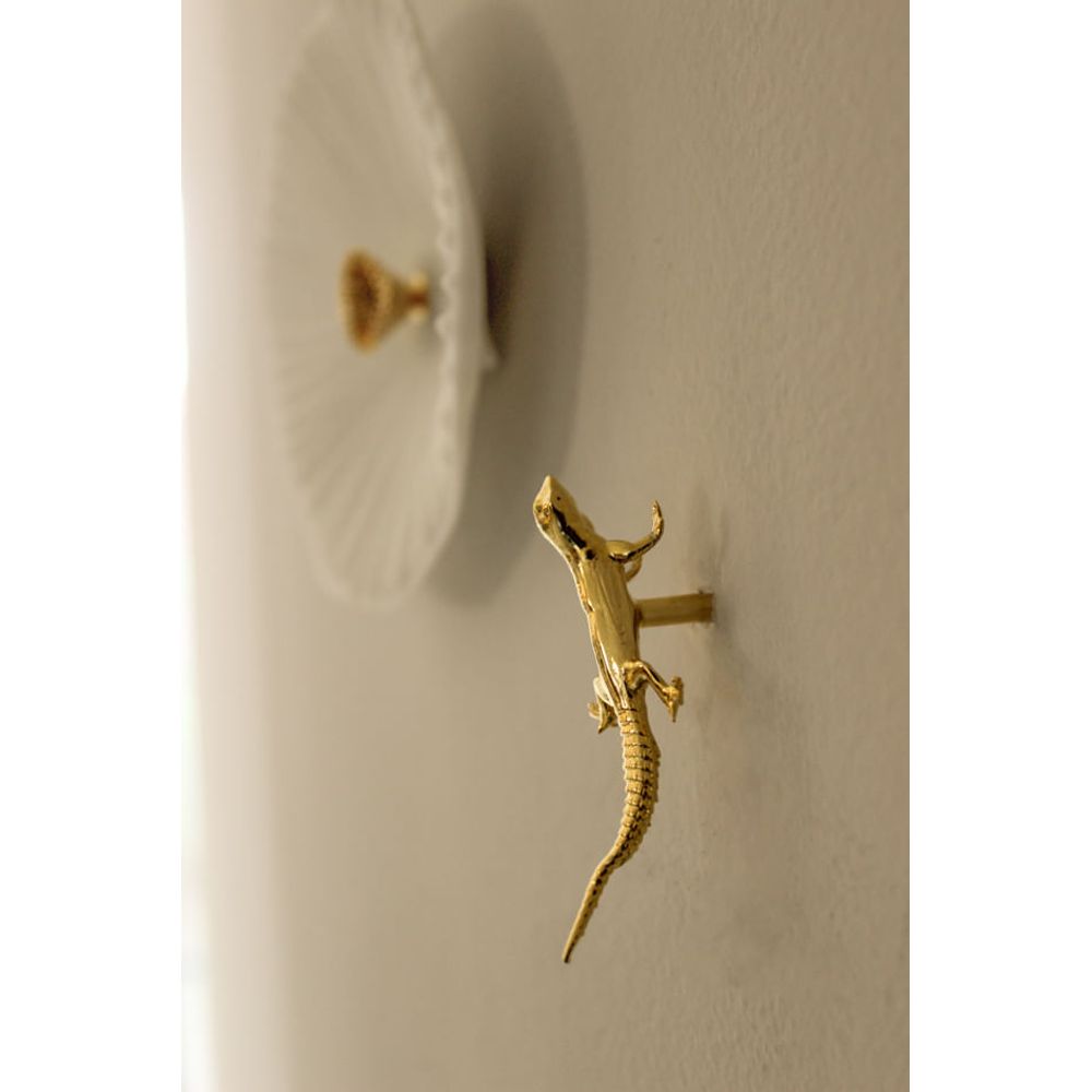 Mini escultura decorativa de parede em latão banhado a ouro, representando um elegante lagarto. Um detalhe marcante que traz sofisticação e personalidade ao ambiente. A fixação é feita com uma bucha banhada a ouro, garantindo charme em cada detalhe.