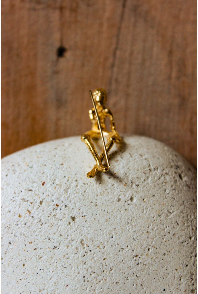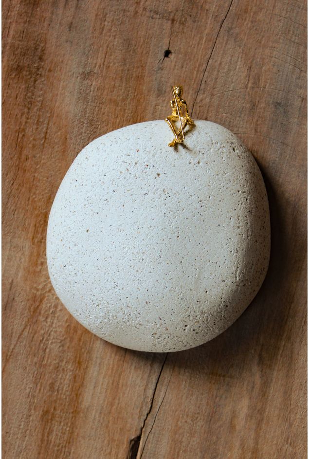Escultura decorativa de parede em formato de pedra feita de concreto, com um pescador sentado na parte de cima da pedra, segurando uma vara de pescar, feitos de latão banhado a ouro. A coleção "Pescador" contempla o anzol particular, que navega à deriva e se alimenta do acaso. Suas figuras carregam tantos significados quanto as incertezas de quem se atreve a navegar.