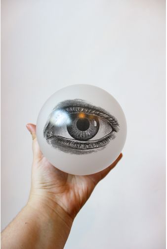 Esfera decorativa feita de vidro leitoso fosco, com aplicações exclusivas do Greghi. Peça super irreverente e atemporal para deixar o seu ambiente com um estilo único! Com design de um olho detalhadamente desenhado, essa peça é para quem gosta do diferente, do único. Podendo ser usado tanto na parede, quanto como objeto de apoio em uma mesa de centro, por exemplo.