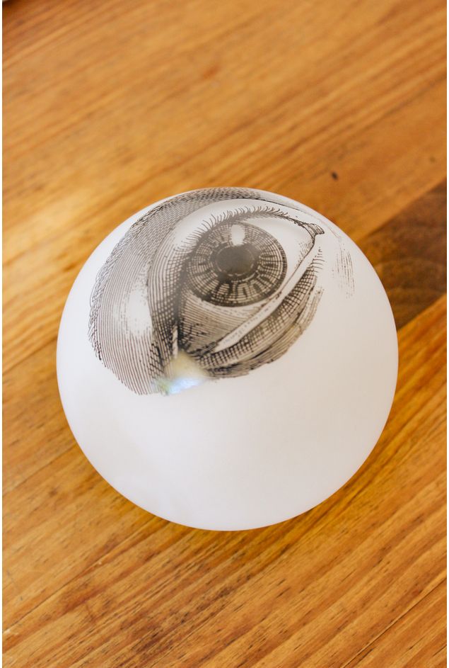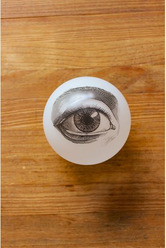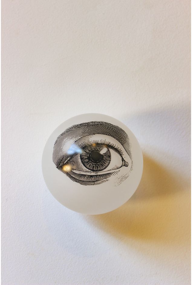 Esfera decorativa feita de vidro fosco leitoso, com aplicações exclusivas do Greghi. Peça super irreverente e atemporal para deixar o seu ambiente com um estilo único! Com design de um olho detalhadamente desenhado, essa peça é para quem gosta do diferente, do único. Podendo ser usada tanto na parede, quanto como objeto de apoio em uma mesa de centro, por exemplo.