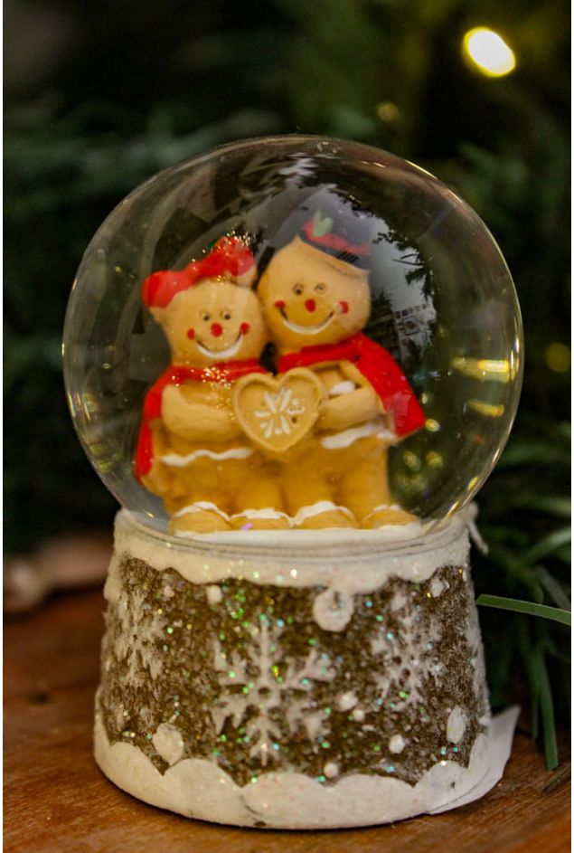 Celebre o Natal com o globo de neve gingerbread, uma linda peça decorativa com as clássicas bolachinhas de natal abraçadas, segurando um coração, ricos em detalhes e sorriso de ternura. Ao agitar flocos de brilho caem suavemente sobre os bonecos, transformando a peça cheia de encanto natalino. Perfeito para presentear ou compor a sua decoração.