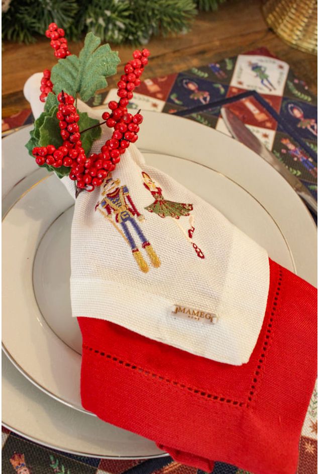 O guardanapo Xmas ballet encanta com seu bordado de uma linda bailarina e soldadinho quebra nozes natalino, uma peça minimalista super fofa em tons vibrantes que dão um destaque para a composição, perfeito para transformar mesas de natal em ocasiões especiais e memória afetivas.