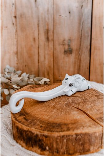 Porta incenso feito em porcelana, num processo manual e super especial. Essa peça ainda recebe aplicação das artes do Greghi Design, que deixa tudo ainda mais especial. Detalhe para o local onde você colocará o incenso: bem na cabeça do elefante, e a tromba dele servirá para acomodar as cinzas. Fala se não é a coisa mais fofa e especial? Combina com aquele seu cantinho pra relaxar ou ainda para acertar no presente.