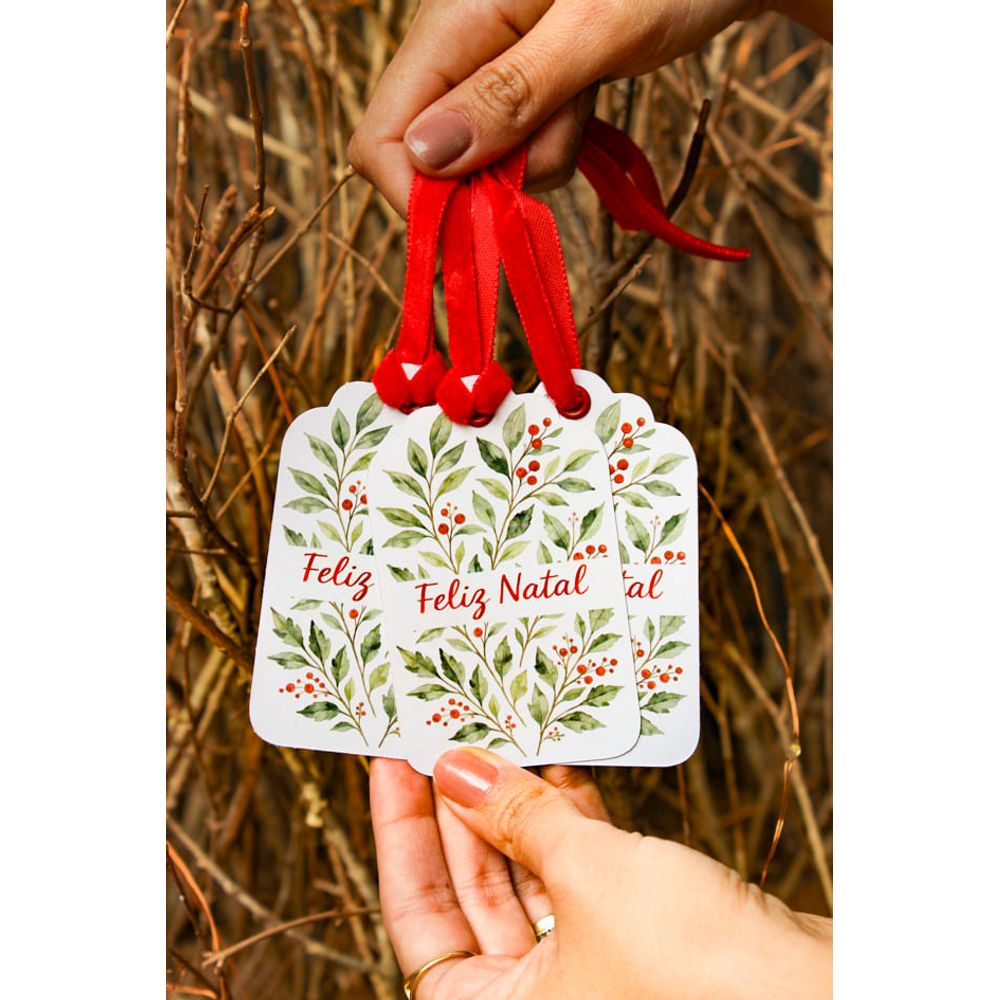 O toque especial para finalizar presentes, um gesto de carinho que transformam momentos, o kit com 3 tags de natal é composto por delicadas berries vermelhas e ramos verdes espalhados pela tag, acompanhada da frase (Feliz Natal), em seu verso contém o espaço para adicionar informações de que e para quem é o presente, cada tag acompanha uma linda fita vermelha em veludo, o que transforma lembrancinhas e embrulhos ainda mais bonito, um detalhe cheio de cuidado que celebra a energia natalina, para presentear com delicadeza e sofisticação.