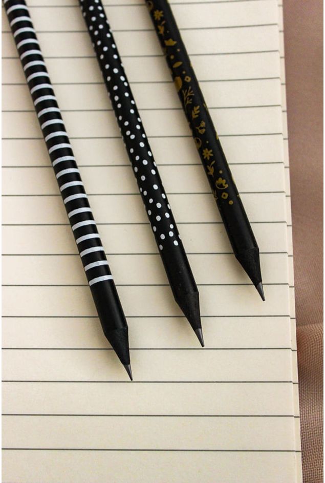 O kit com três lápis traz o charme e elegância para cada anotação, cada um com seu design em preto e branco, sendo listras, bolinhas ou ramos, o conjunto une estilo e personalidade, com ponta suave perfeito para acompanhar cadernos de anotações que a mimo galeria possui no site, perfeito para quem ama papelaria personalizada.