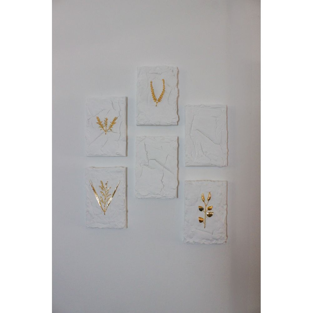 Um conjunto de peças artísticas, que unem delicadeza e riqueza em cada detalhe, sua arte é composta pela textura em branco aplicado em gesso, criando uma superfície sensorial e natural, no centro o destaque em dourado, que traz a elegância em seu brilho como uma verdadeira joia, cada quadro com uma figura aplicada sendo: Trigo, lavanda, ramo de pimenta, alecrim e quadros lisos com textura para dar equilíbrio á composição.