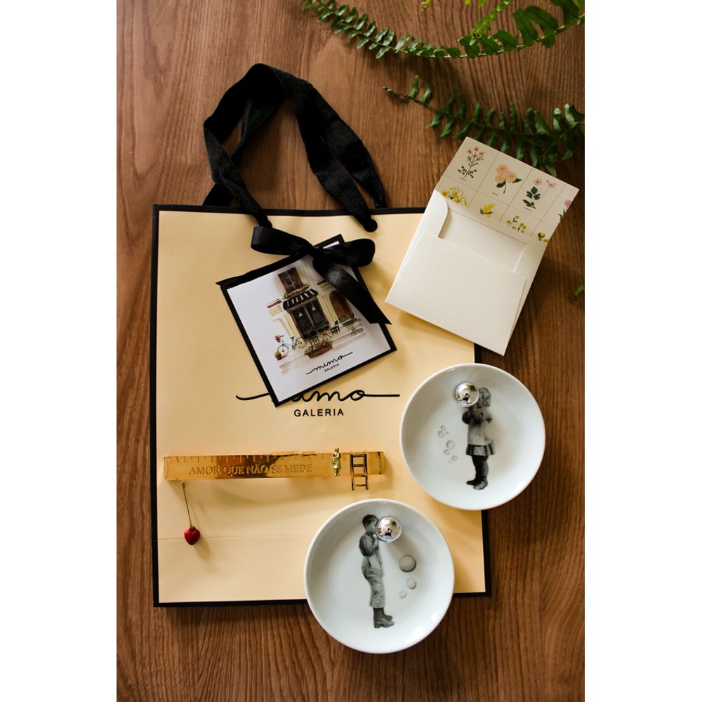 Um kit para presente com peças decorativas que levam a imaginação, com a dupla de pratinho decorativo bola de sabão, estampando figuras de crianças retrô, enquanto a encantadora régua decorativa, transmite leveza e destaque para a decoração com a frase (Amor que não se mede), peças que carregam afeto e charme. Um mimo elegante para presentear criando uma experiencia memorável.