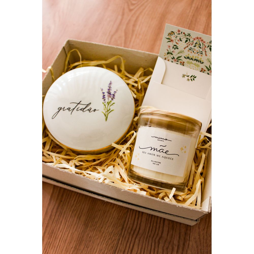 Kit para presente composto pela vela decorativa com fragrâncias doce e agradável, para presentear com memorias, estampada da frase (Mãe seu amor me aquece), enquanto o porta joias gratidão transmite beleza com a lavanda aplicada delicadamente sobre a peça, perfeito para guardar pequenas joias, o kit presente que surpreende com detalhes.