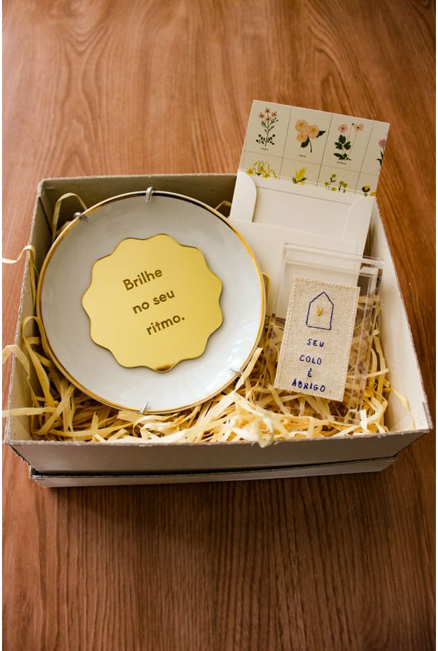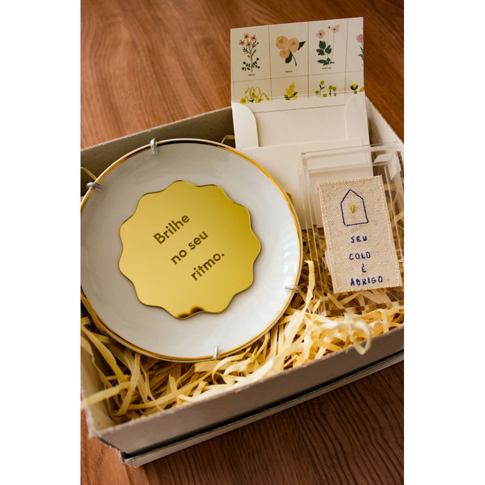 Economia de R$ 87,80Kit presente colo de luz, uma composição delicada e cheia de significado para presentear, formada pelo prato decorativo com borda em filete com a frase (Brilhe no seu ritmo.), gravada sobre a placa espelhada em acrílico dourado, uma peça encantadora para pendurar na parede ou apoiar em uma estante, juntamente está o quadro em acrílico com a delicada frase bordada (Seu colo é abrigo), e para completar o cartão de agradecimento para dedicar uma mensagem especial, para emocionar e decorar com sensibilidade.