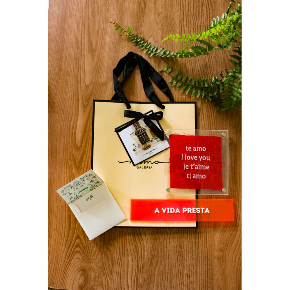 Kit para presente composto por muito amor, com o quadro em acrílico bordado com palavras de afeto, sobre o tecido em cor vermelho, o que traz todo o destaque para decorações, enquanto a placa em acrílico com a frase (A vida presta), une o design transparente com as letras em 3d, trazendo movimento para a parede decorativa, o kit que fala sobre o amor em diversas línguas de um jeitinho especial, perfeita para presentear alguém querido(a) com uma combinação de cor e emoção.