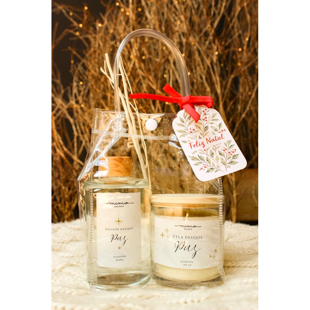 Nesta celebração de natal a mimo pensou em cada detalhe para deixar este momento ainda mais especial e afetivo. O kit em uma embalagem super delicada e tom translúcido já revela o encanto dos presentes antes mesmo de ser aberto, com tag natalina acompanhada da frase (Feliz natal) e design coberto por delicadas berries, o kit é composto pela vela desejos que contém uma linda embalagem em vidro com tampa em bambu, envolta da vela com detalhes de pequenas estrelas e a palavra (Paz) com tipografia festiva, sua fragrância contem a combinação de Morango verde, laranja, flor de lótus e musk, tornando em um aroma marcante e suave. Já o difusor desejos completa o kit com seu acabamento em vidro e tampa em bambu, contém a mesma fragrância da vela, juntos se unem em uma fragrância silvestre entregando frescor e a magia natalina.