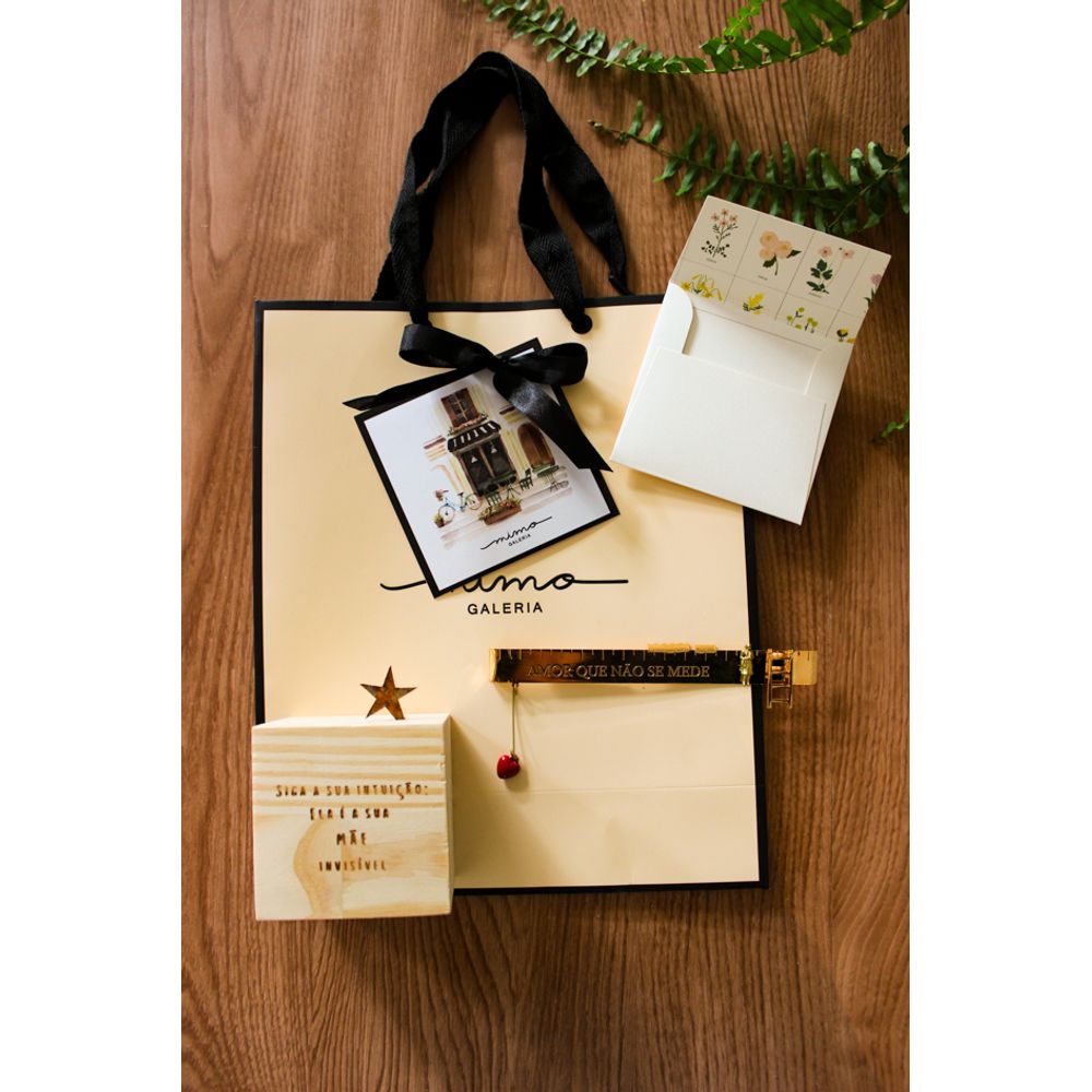 Um kit para presente que celebra o amor em pequenos detalhes, composto pelo cubo decorativo com a frase (Siga a sua intuição: ela é a sua mãe invisível). Uma peça rustica feita em madeira com uma pequena estrela em ferro no topo, enquanto a mais amada régua decorativa com a frase (Amor que não se mede), e um belo pingente com coração vermelho na ponta, uma peça delicada e requintada em dourado, banhada a ouro, um mimo que transforma gesto em memorias, levando leveza e amor para a decoração.