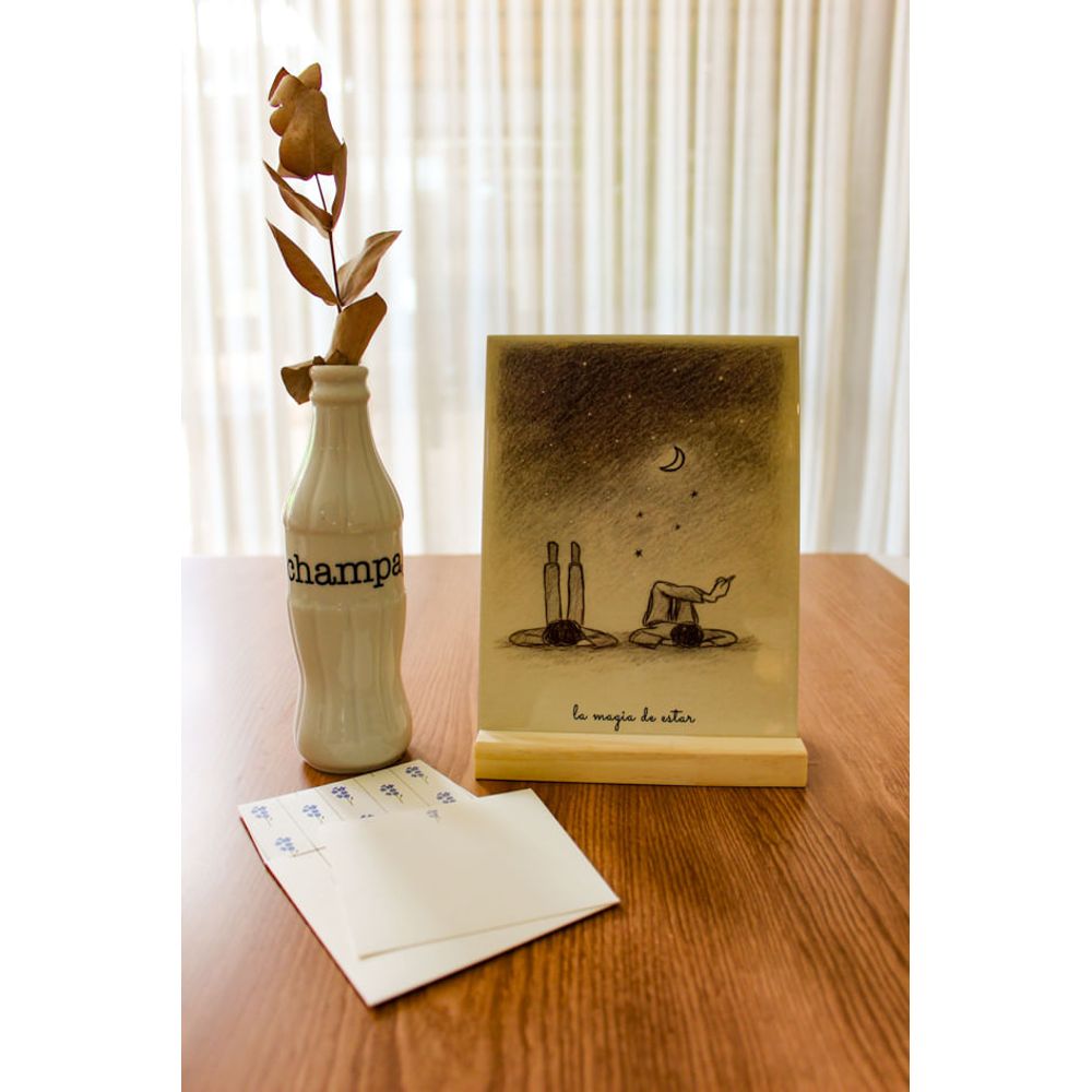 O kit para presente é composto pela garrafinha decorativa em porcelana, uma peça em formato clássico de garrafinha em forma de escultura, com a palavra (champagne), o azulejo decorativo com ilustração em rabiscos em grafite de duas figuras deitadas observando o céu, com a frase (La magia de estar) em espanhol que se traduz em (A magia de estar), poesia que inspira a conexão, e para finalizar acompanha o cartão de agradecimento kate com figura de delicadas flores, e espaço para dedicar uma mensagem escrita à mão para alguém especial, o mimo perfeito para presentear.