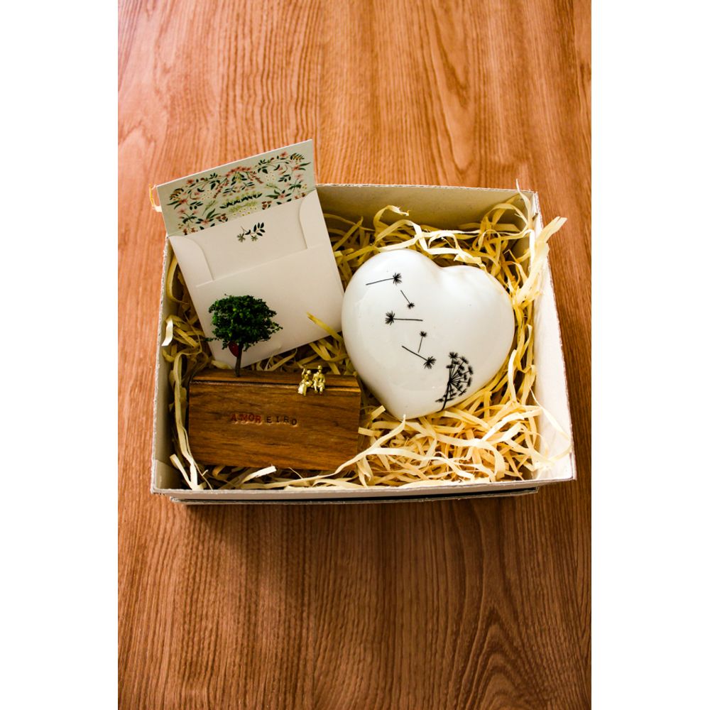 O kit para presente amoreiro é composto por peças delicadas e poéticas, sendo o bloco poético com miniatura de uma arvore com pingente de coração vermelho e figuras em dourado repousando sobre o bloquinho em uma expressão de contemplação, com a frase amoreiro que destaca (Amor) em vermelho dentro da palavra. Já o mini coração em porcelana vem todo sofisticado na cor branco e preto com a imagem de um dente de leão que se desfaz, e para finalizar este maravilhoso presente o cartão de agradecimento Lili encanta com seus detalhes de realeza, com espaço para dedicar uma mensagem feita a mão, o mimo encantador para presentear com afeto e significado.