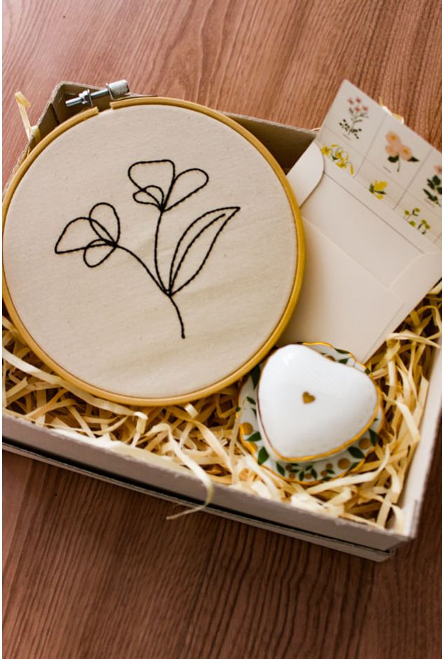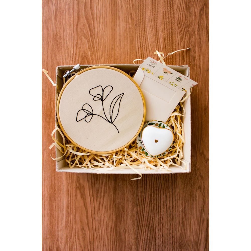 Kit Presente Lírio de Afeto, uma composição delicada e cheia de sensibilidade formada pelo bastidor bordado com desenho floral em traço minimalista e a dupla de pratinho e porta joia com a estampa do verdadeiro jardim de encanto com folhagens verdes e filete em ouro, unindo leveza, beleza para guardar as pequenas joias do dia a dia, o mimo penando em transmitir afeto e cuidado para aquela pessoa especial.