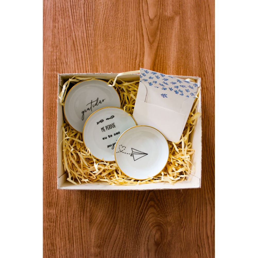Economia de R$ 38,80O kit para presente luxo é composto por peças delicadas e elegantes, sendo os pratinhos decorativos feito em porcelana e filete ouro em suas bordas o detalhe que torna tudo mais luxuoso, cada pratinho com uma figura ou frase, sendo (Gratidão), (Sinto muito, me perdoe, eu te amo, sou grato), peças versáteis para pousar ao lado da cama e acomodar brincos, anéis, chaves ou para pendurar na parede, não acompanha suporte. A escolha do mimo perfeito para presentear.