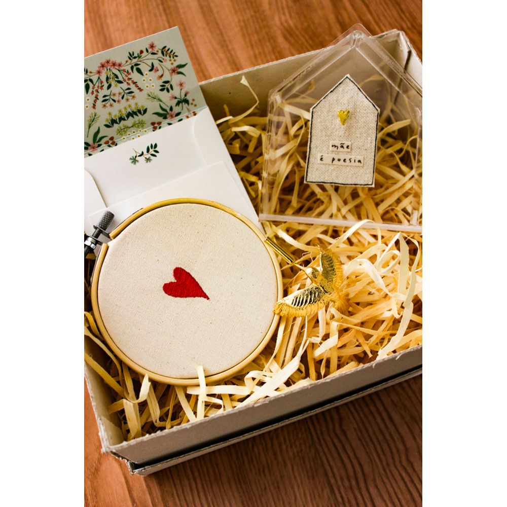 Kit presente mãe é poesia, uma composição delicada e cheia de significado para o Dia das Mães, formada pelo bastidor bordado com um mini coraçãozinho vermelho, enquanto o acrílico em formato de casinha, guarda o bordado da mensagem (Mãe é poesia), com um delicado coração dourado que traz todo um charme para a peça, e para deixar o mimo ainda mais requintado, o beija flor banhado a ouro é uma delicada peça para pendurar na parede, um verdadeiro encanto. O mimo pensado para traduzir em pequenos símbolos tudo aquilo que a presença materna representa: afeto, abrigo e beleza, perfeito para emocionar e decorar com poesia.