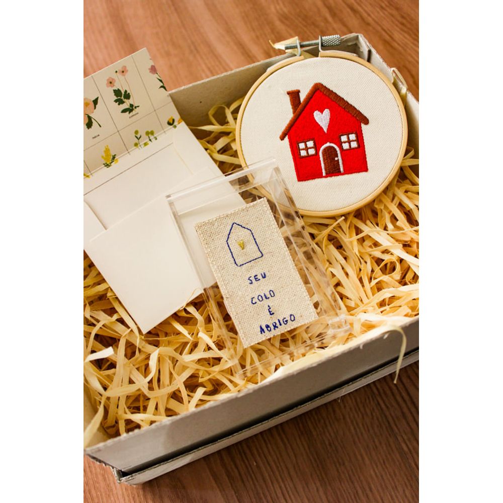 Kit presente meu abrigo, composto por peças afetivas e delicadas, formada pelo mini bastidor bordado com uma casinha vermelha, representando um lugar seguro, enquanto o quadro em acrílico em formato de caixinha guarda um belo bordado da frase (Seu colo é abrigo). Um presente cheio significado que traduz a proteção e o amor que moram na presença materna. Uma escolha bonita para presentear com delicadeza e significado.