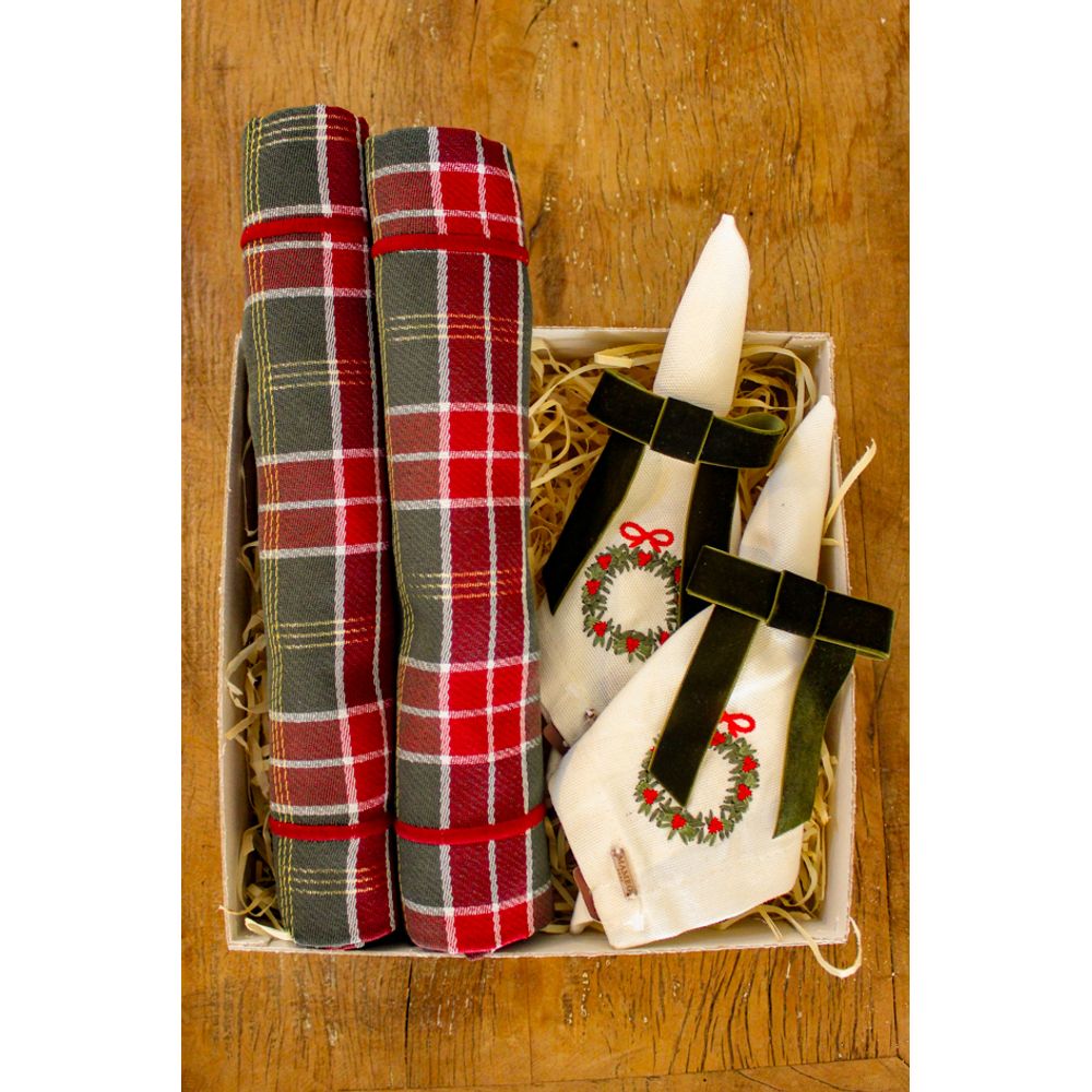 Um kit natalino para a celebração de natal, composto por guardanapos com a figura de uma delicada guirlanda em bordado, anel porta guardanapos em veludo cor verde, o que entrega toda a sofisticação para a mesa posta, e para completar, o lugar americano xadrez com as cores clássicas de natal, o kit festivo completo para fechar com chave de ouro a sua celebração com alguém especial ou surpreender como presente.