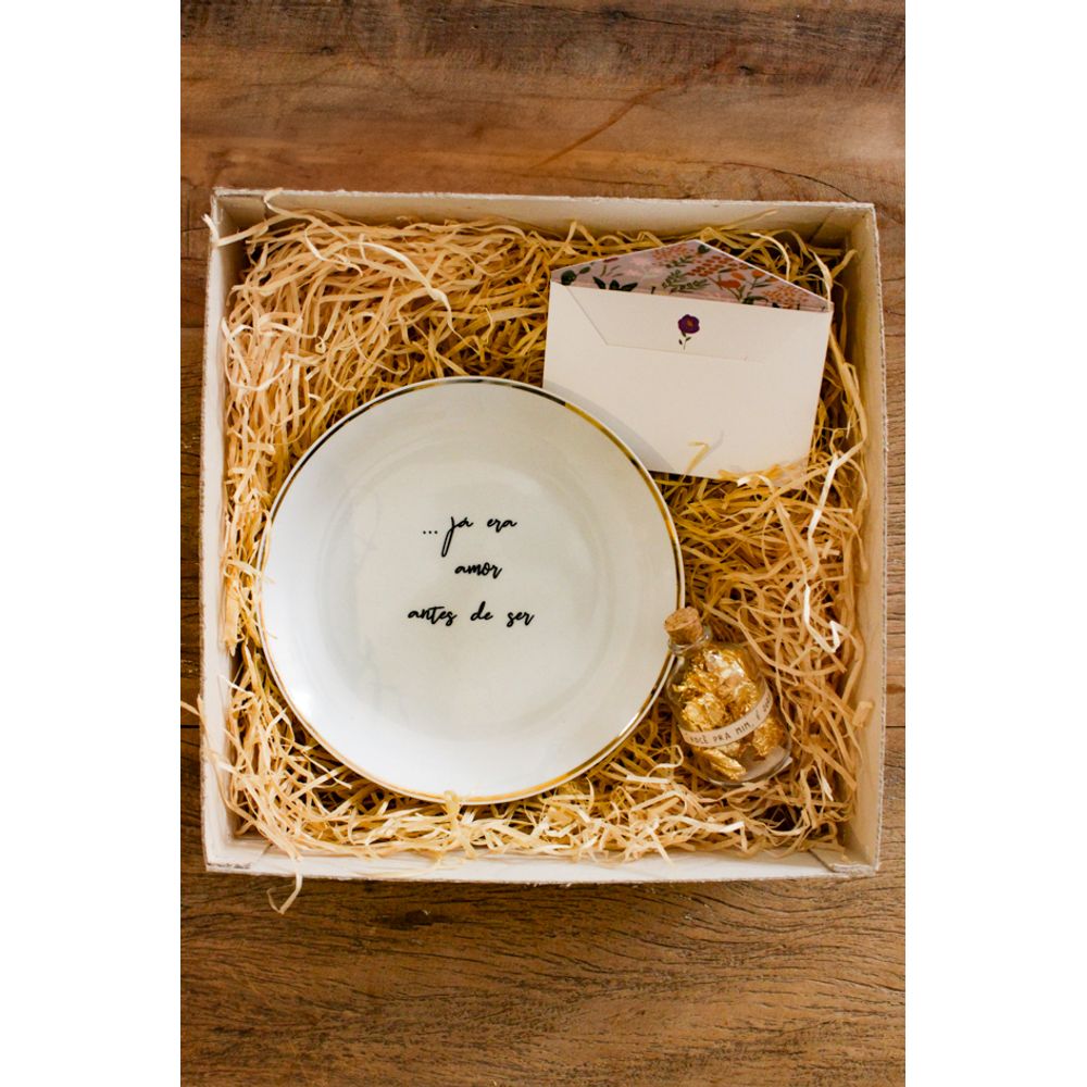 O kit presente refinado amor é uma composição requintada, combinando delicadeza e poesia, o kit contém um prato decorativo branco com borda em filete ouro, e ao centro a poética frase (Já era amor antes de ser), uma peça delicada e refinada, acompanha uma delicada garrafinha decorativa com folhas de ouro em seu interior, com a sutil frase (Você para mim é ouro!), juntamente com um delicado cartão de agradecimento para se expressar com amor e surpreender aquela pessoa especial. símbolo de preciosidade e afeto, um kit super elegante e poético para celebrar e surpreender aquela pessoa especial.