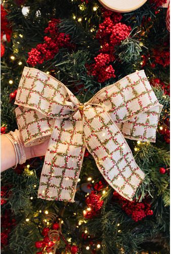 Laço decorativo na cor nude, enfeitado como se fossem festões em padronagem quadriculada. Perfeito para complementar o seu natal! Preencha a sua árvore com uma combinação de laços super charmosos ou decore um presente especial!