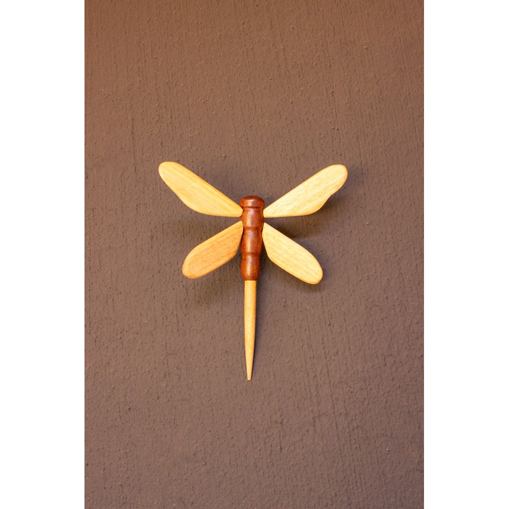 Escultura decorativa de parede feita à mão em madeira natural, em formato de libélula e detalhes talhados com delicadeza. Um simples detalhe que transforma o ambiente trazendo a leveza e a poesia do voo para as paredes. A peça é fixada pelo gancho, criando um efeito visual encantador de movimento no ar.