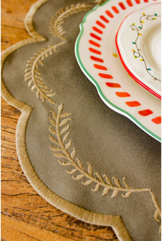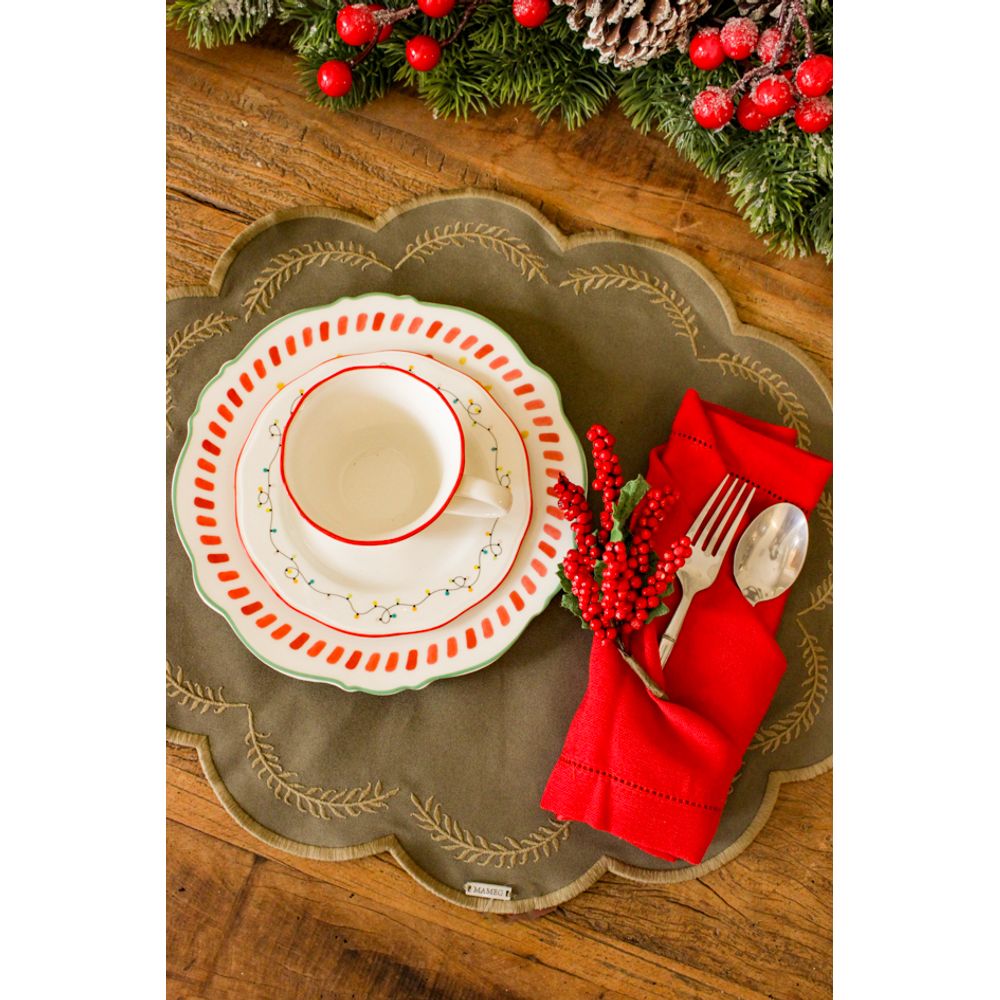 O lugar americano sereno tom musgo é uma peça super elegante e delicada, sua borda com detalhes sinuosos e folhagens bordadas encantam a peça. Perfeito para compor mesas refinadas e especiais.