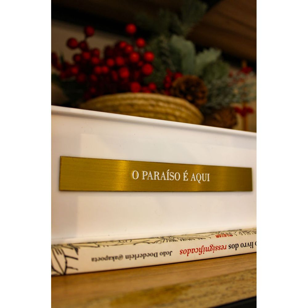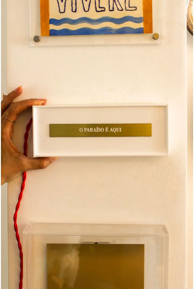 Uma dose diária de motivação, a luminária de parede é uma peça com design clean minimalista repleta de sofisticação, transmitindo inspiração e aconchego com o ponto de luz amarelado. Composta por acrílico em cor branco e placa metálica que se destaca ao centro da peça em tom dourado, com a frase gravada (O paraíso é aqui), o fio em tom vermelho feito em tecido trançado adiciona um charme a mais para a beleza da peça, além de oferecer flexibilidade para pendurar na parede ou apoiar em um móvel.