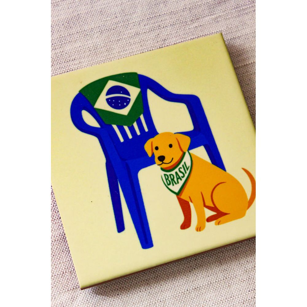 Mini azulejo decorativo com o símbolo que faz parte do patrimônio emocional brasileiro, o cachorro caramelo, é o mais amado das ruas e dos memes, a peça ilustra o carismático animalzinho ao lado de uma cadeira de plástico, um momento clássico e icônico, perfeito para quem deseja decorar com brasilidade e humor.