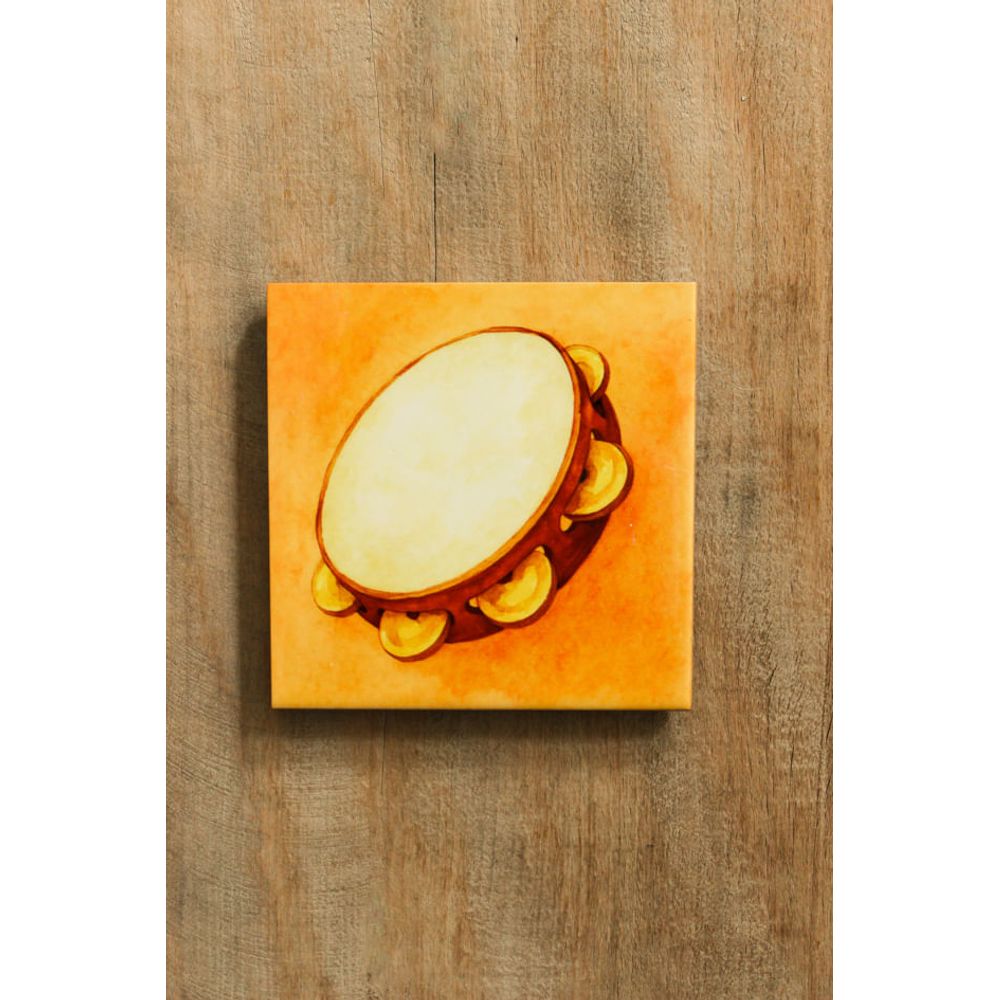 Mini azulejo decorativo com a ilustração de um pandeiro, significado do puro ritmo brasileiro, um símbolo das rodas de samba, e festa populares, o que representa alegria e tradição, a imagem ilustra o pandeiro com cores quentes, perfeito para decorar paredes com arte que valoriza a energia e cultura.