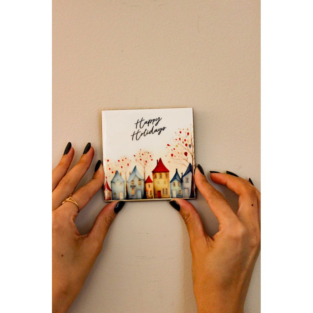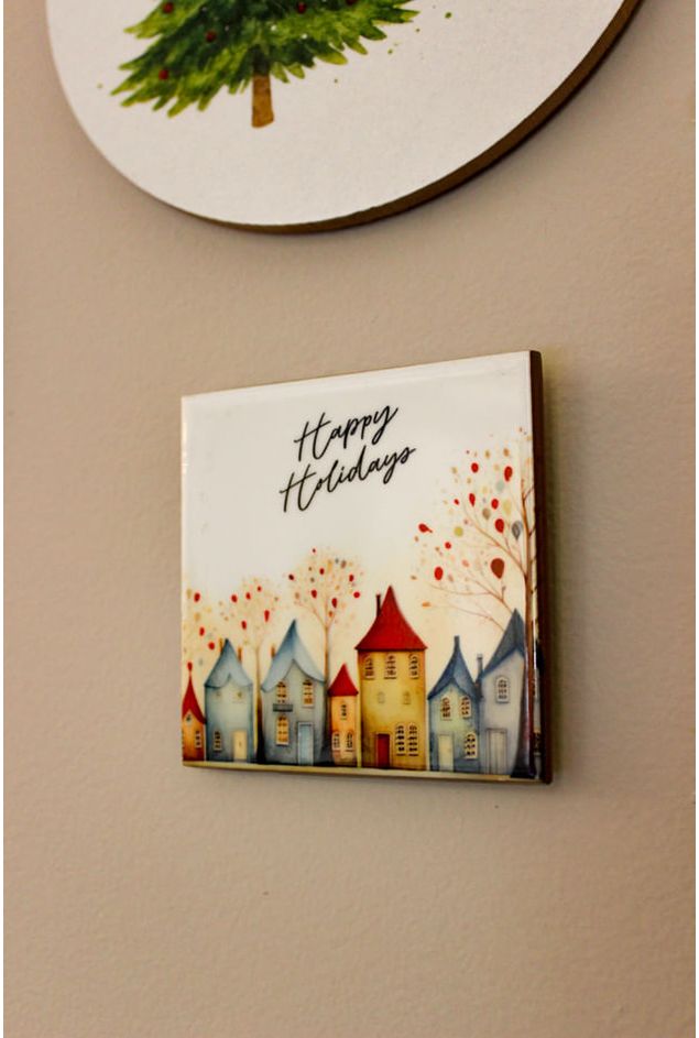 Um mini azulejo de natal para ativar a energia natalina em decorações, ideal para pendurar na parede e compor com outras peças decorativas de parede, estampado com belas vilinhas natalinas em aquarela, uma peça divertida e cheia de cor para celebrar o natal com a magia da estação, no topo a frase ‘’Happy holiday’’, que significa ‘’Boas festas’’. Decore com celebração ou presenteie alguém especial.