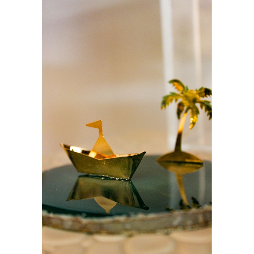 A mini escultura ilha dourada é uma peça totalmente refinada, representando uma ilha com delicada palmeira e barquinho em formato origami banhados a ouro, sobre a base de pedra preciosa que imita as nuances das águas, uma obra artística que encanta, criando um cenário de refúgio, perfeito para compor aparadores ou estantes com um toque de sofisticação e arte.