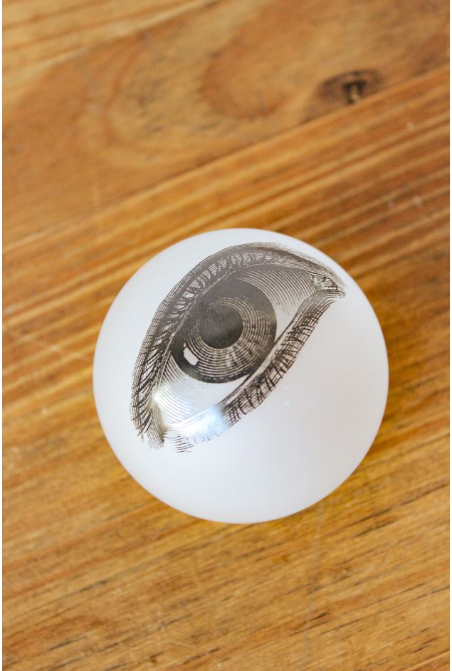 Esfera decorativa feita de vidro leitoso fosco, com aplicações exclusivas do Greghi. Peça super irreverente e atemporal para deixar o seu ambiente com um estilo único! Com design de um olho detalhadamente desenhado, essa peça é para quem gosta do diferente, do único. Podendo ser usada tanto na parede, quanto como objeto de apoio em uma mesa de centro, por exemplo.