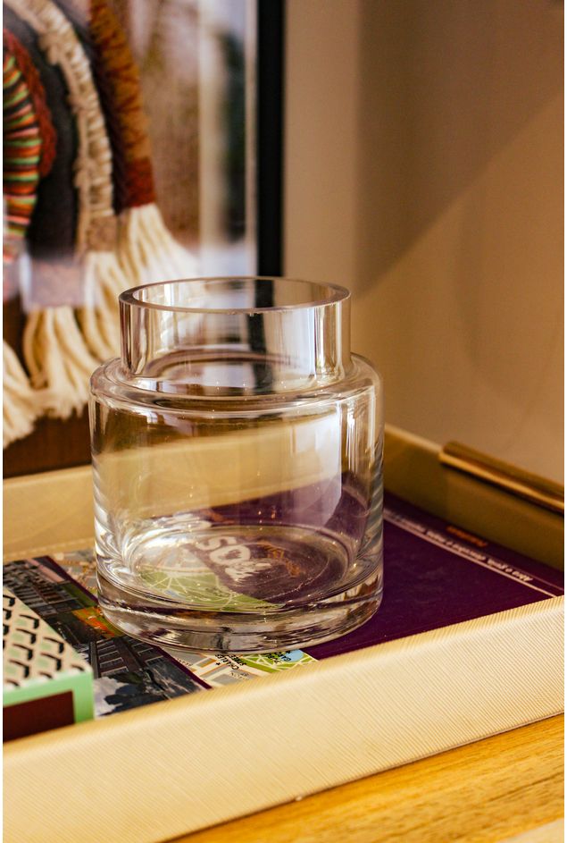 Mini vaso decorativo de vidro, em formato redondo com gola. Uma peça chave para compor pequenos ambientes e composições, o decor do seu lavabo ou quem sabe até servir como porta cápsulas de café.